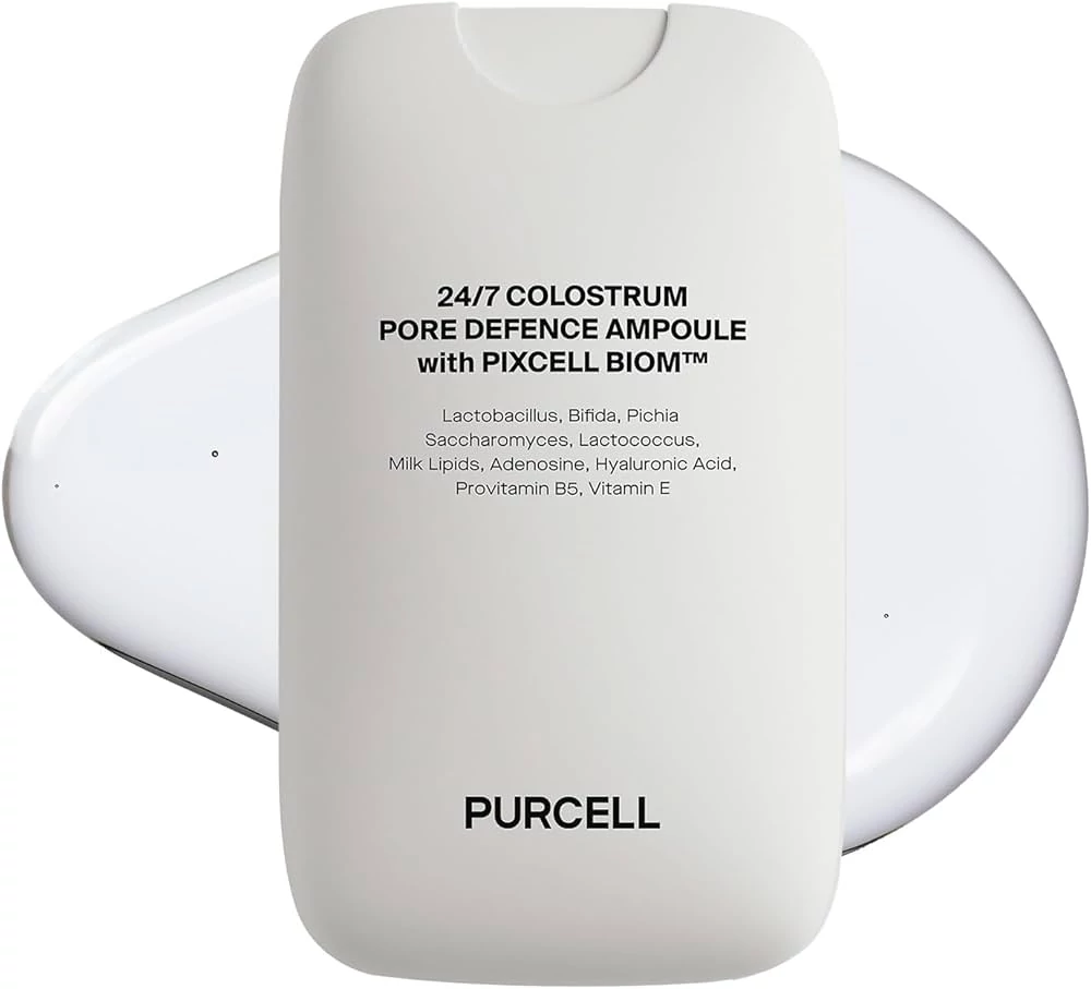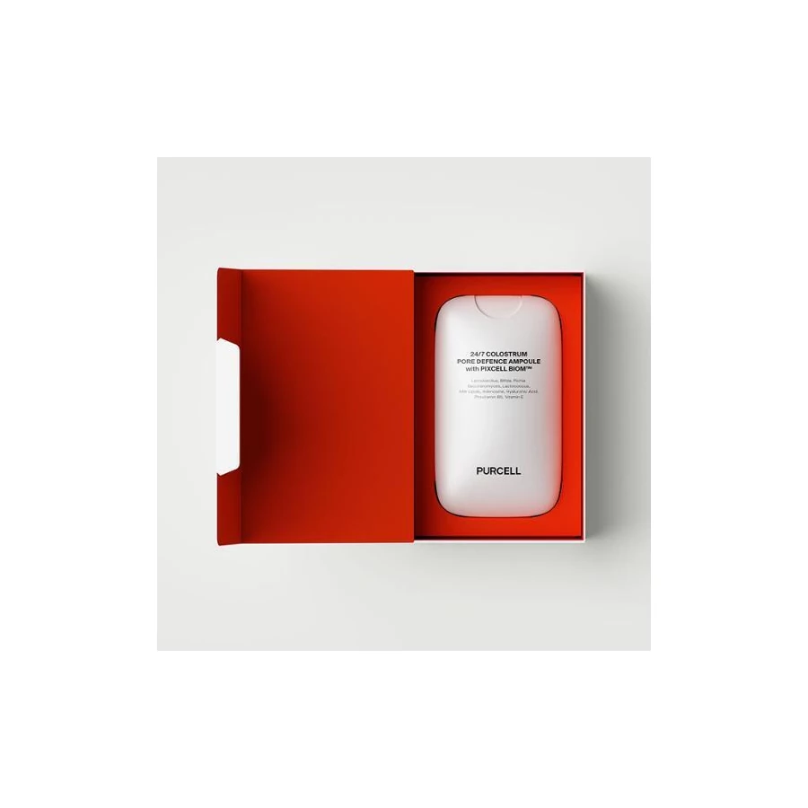 Purcell 24/7 Colostrum Pore Defence Ampoule — zaglađujuća ampula u obliku spreja koja omogućuje ravnomjernu primjenu na kožu. Napredna formula sadrži ojačavajuće i umirujuće enzime bifidobakterija 3,6% i laktobacilne enzime 3,6%, kao i hranjivi fermentirani lizate mliječne kiseline. Peptidi zaglađuju površinu kože i vizualno smanjuju pore, dok mliječni lipidi i pantenol podržavaju regeneraciju i jačaju hidrolipidnu barijeru. Pakiranje je praktično za putovanja, a proizvod se može koristiti i preko šminke za produljenje trajnosti.